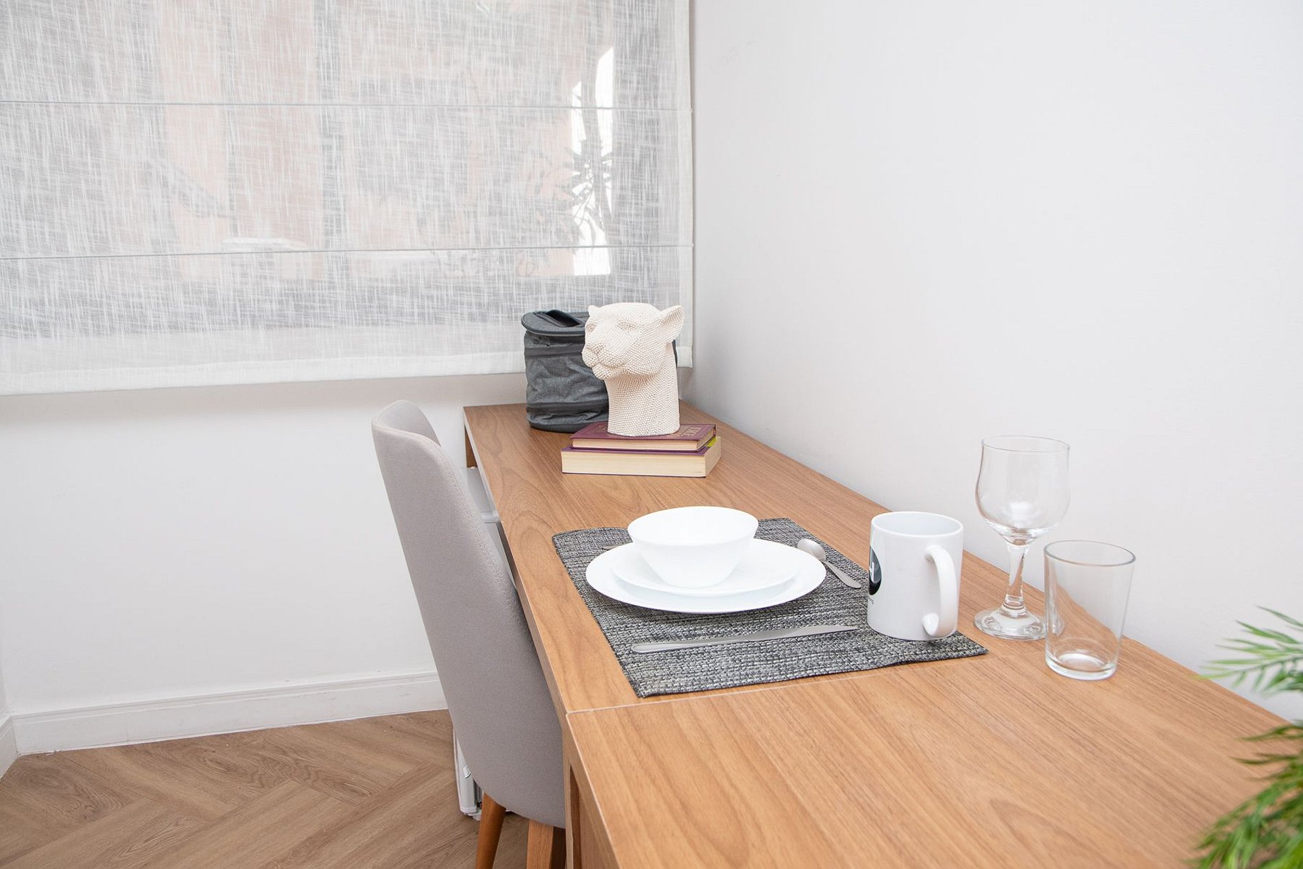 Copa compacta em todos os andares, equipada com mesa e cadeiras, ideal para refeições rápidas, como um café da manhã.