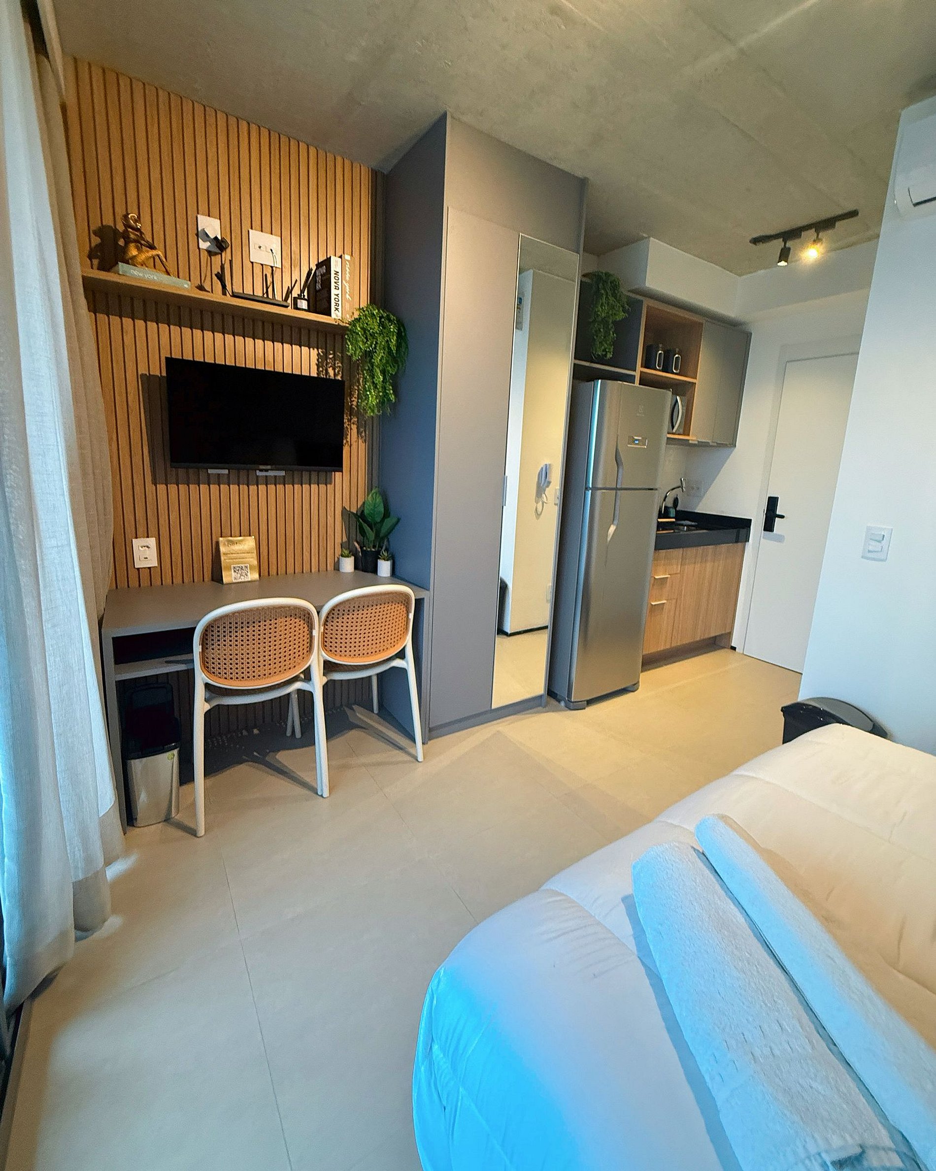 Nossos studios fue pensado para que no abriera mão de estilo, conforto y praticidade. Imagine un lugar donde el diseño contemporáneo se encuentra con el aconchego de un lar, criando el escenario perfecto para su viaje a São Paulo.