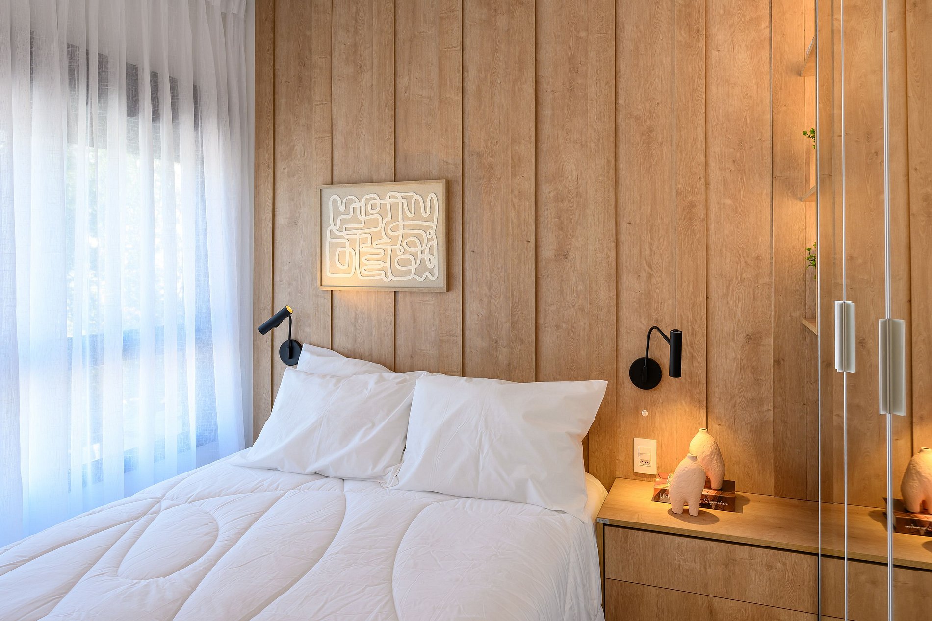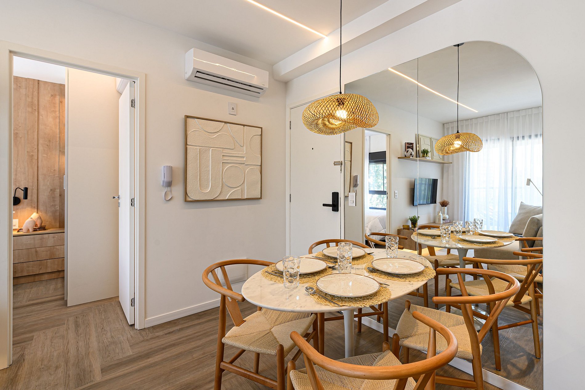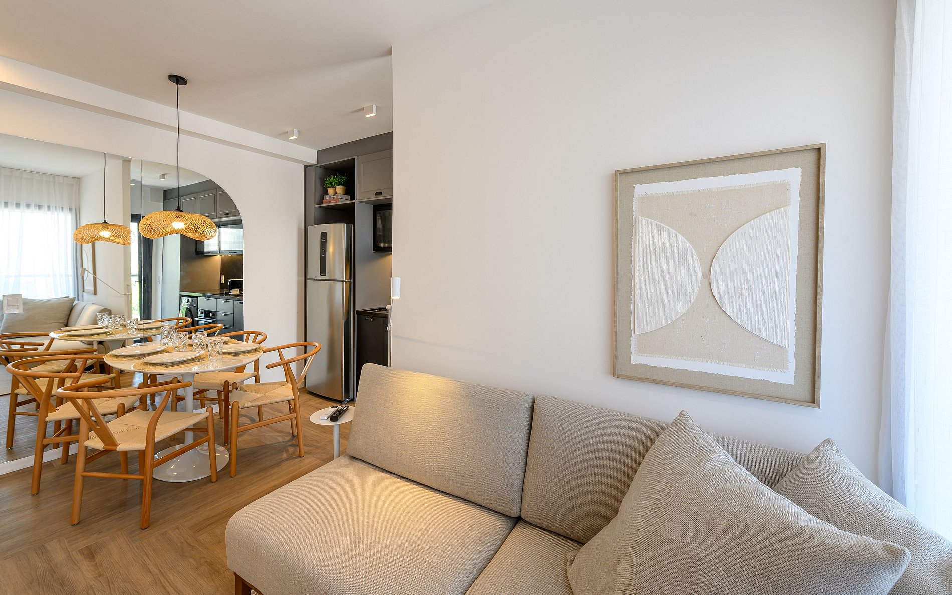Lindo apartamento elegante de 1 dormitório, com móveis modernos e sofisticado onde o design contemporâneo encontra o aconchego de um lar, criando o cenário perfeito para sua viagem a São Paulo.
