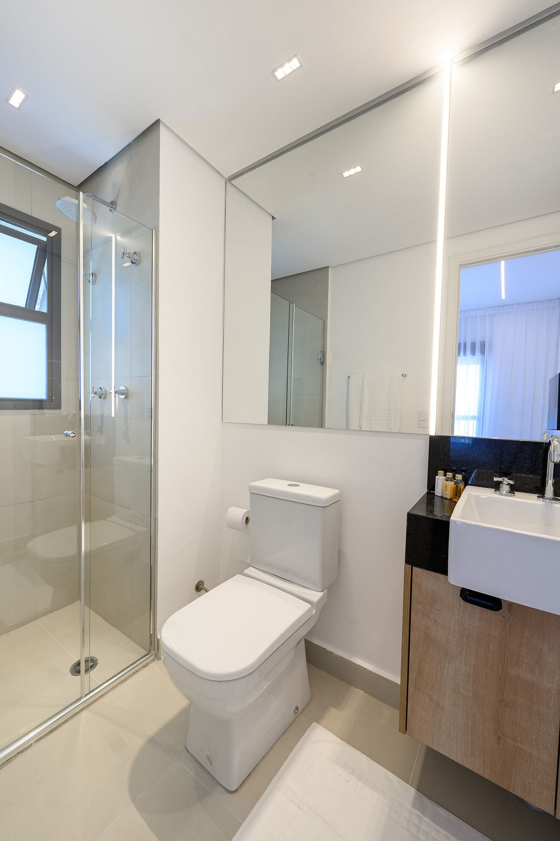 • Banheiro: Design sofisticado e ducha com sistema de alta pressão.
