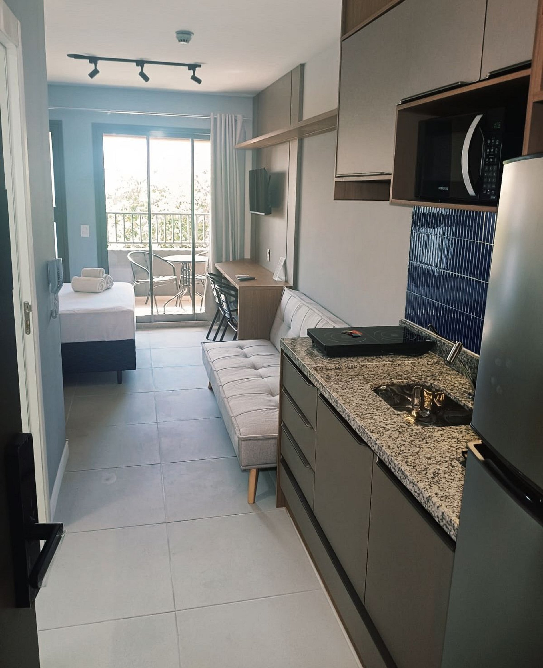 Espaço completo com cama casal, cozinha moderna equipada, banheiro sofisticado e ducha de alta pressão. Inclui Wi-Fi rápido, Smart TV, ar-condicionado e área de trabalho funcional.