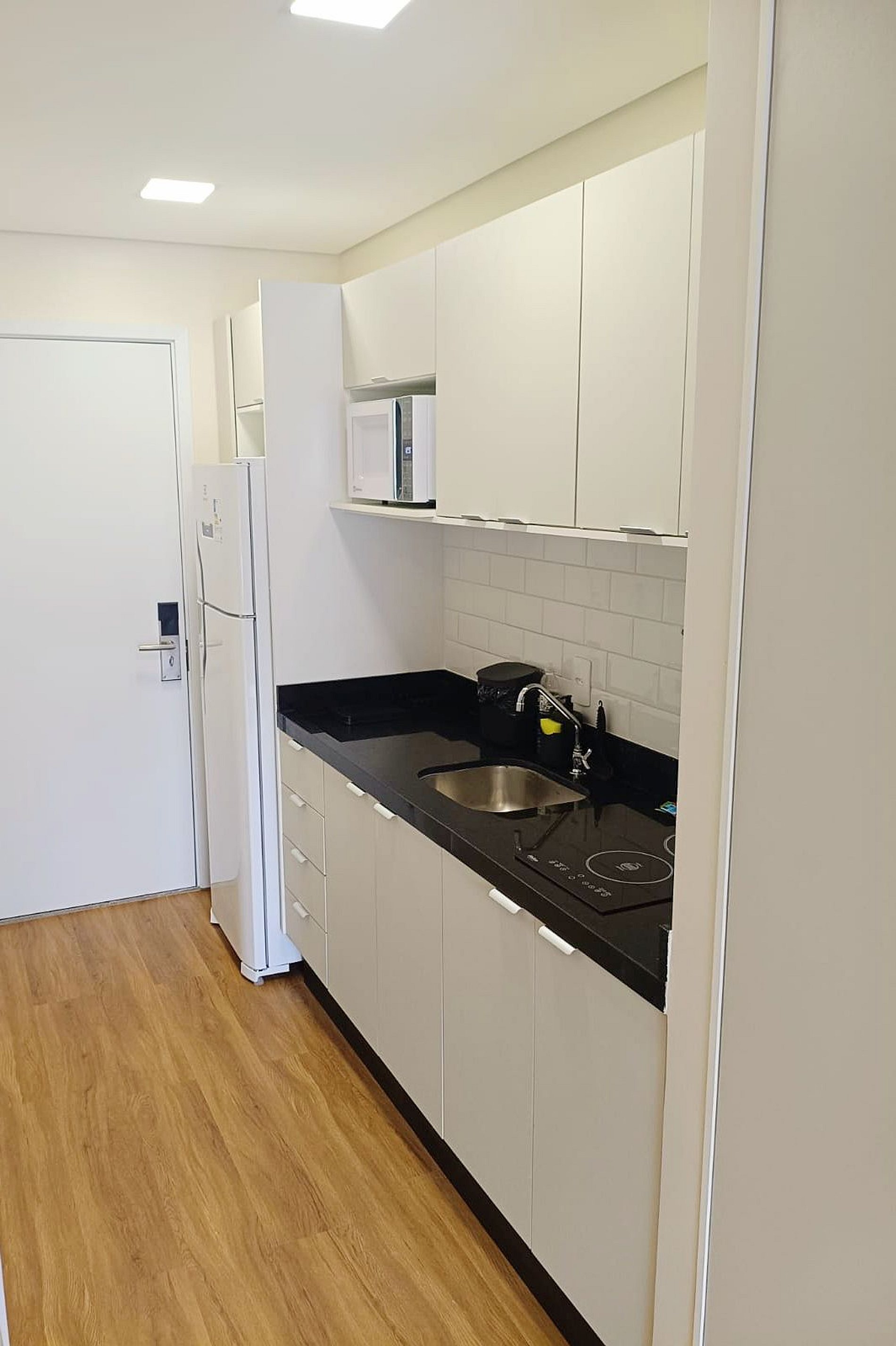 Sobre o espaço: • Acomodação: Cama queen-size com enxoval de alta qualidade. • Cozinha: Planejada e equipada com eletrodomésticos modernos, ideal para o preparo de qualquer refeição. • Banheiro: Design sofisticado e ducha com sistema de alta pressão. • Tecnologia: Wi-Fi de alta velocidade, Smart TV e ar-condicionado. • Trabalho: Bancada funcional para home office.