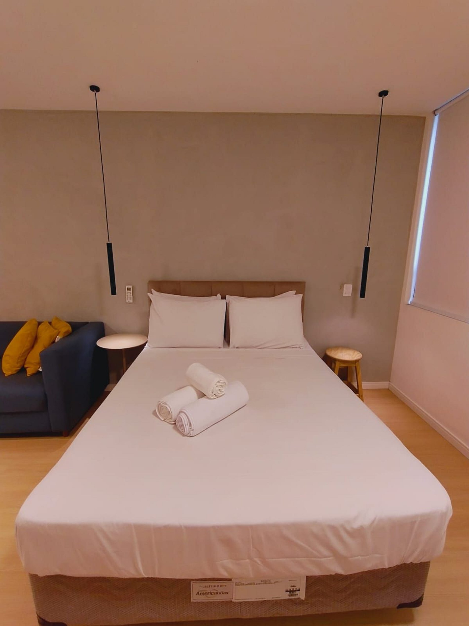 Studio com muito espaço, conforto e sofisticação em um apartamento moderno e aconchegante. Móveis elegantes, cozinha equipada, Smart TV, ar-condicionado e Wi-Fi de alta velocidade. Localização tranquila, segura e com portaria 24h. Perfeito para uma estadia prática e confortável.
