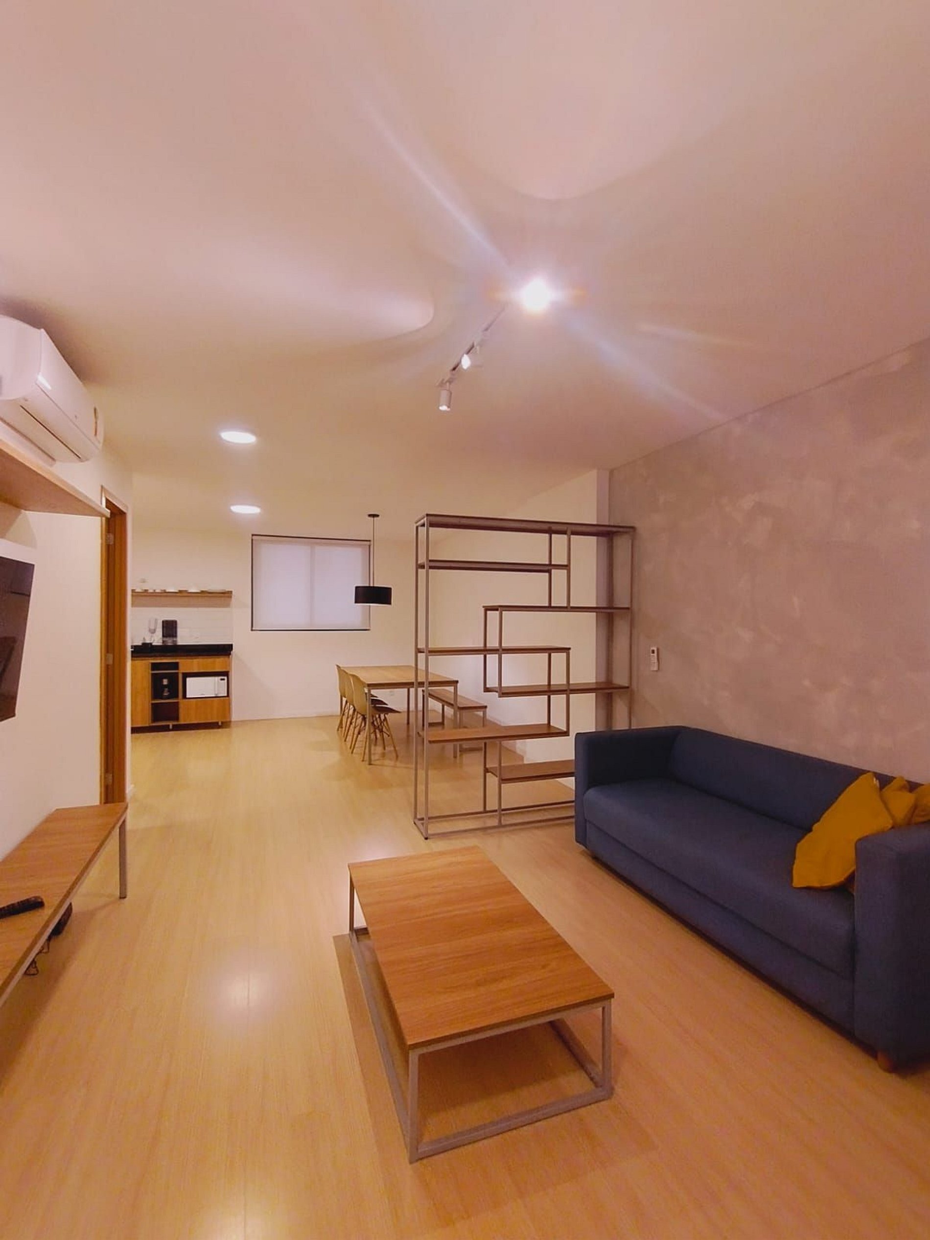 Apartamento de 1 dormitório com muito espaço, conforto e sofisticação em um apartamento moderno e aconchegante. Móveis elegantes, cozinha equipada, ar-condicionado. Localização tranquila, segura e com portaria 24h. Perfeito para uma estadia prática e confortável.