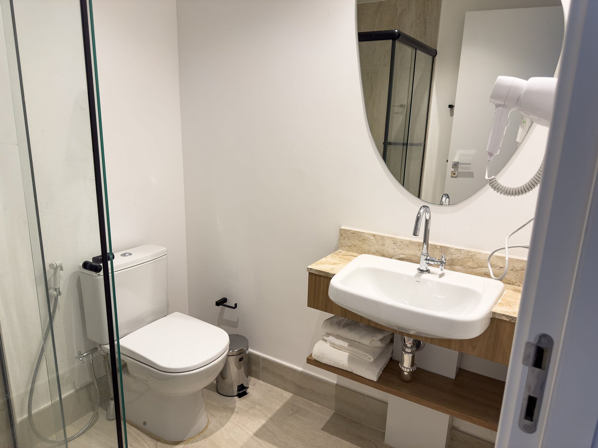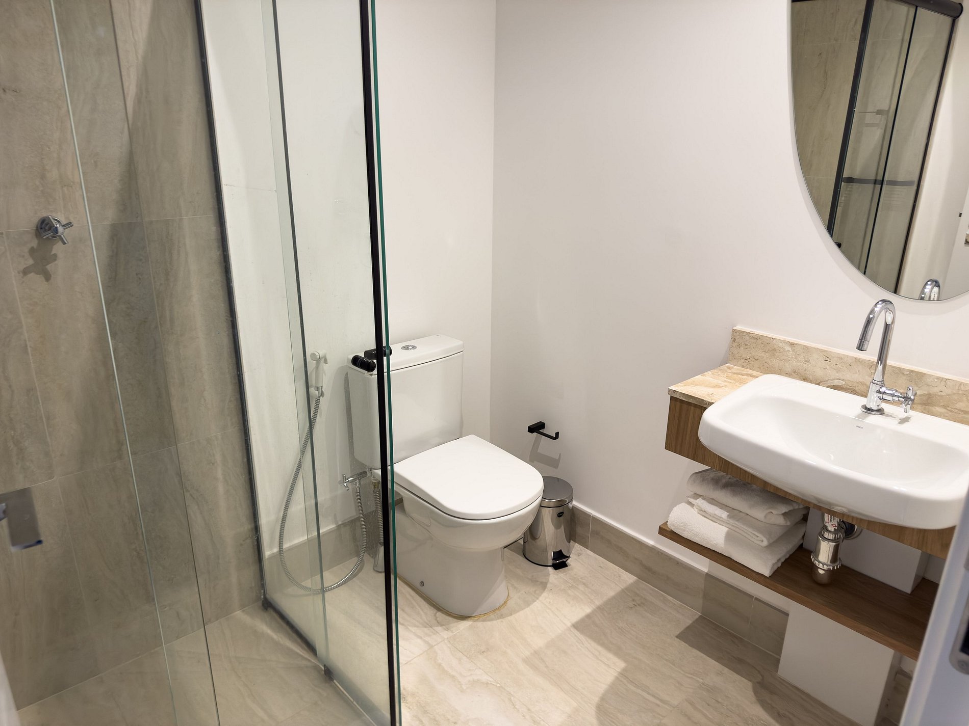• Banheiro: Design sofisticado e ducha com sistema de alta pressão.
