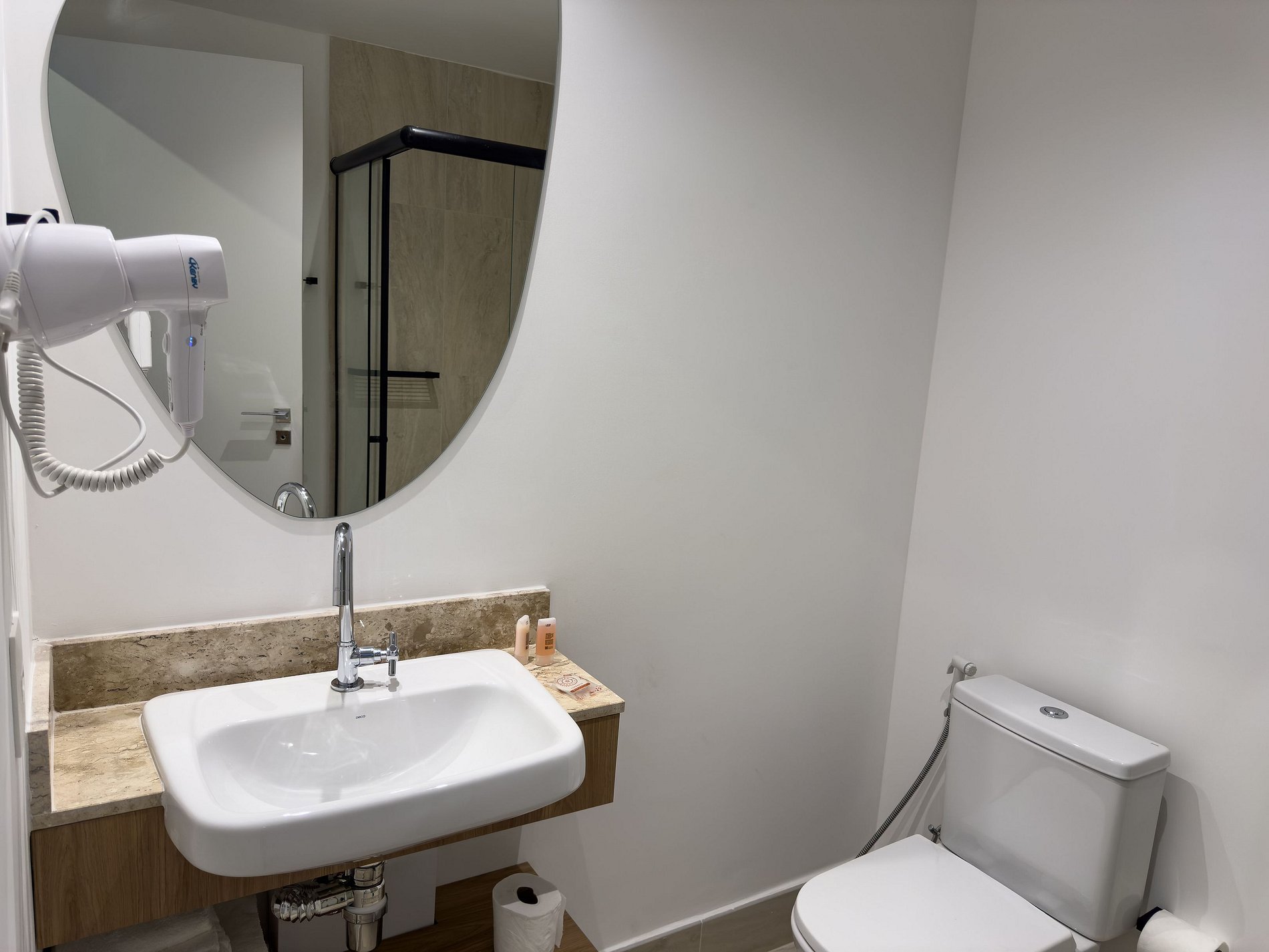 • Banheiro: Design sofisticado e ducha com sistema de alta pressão.
