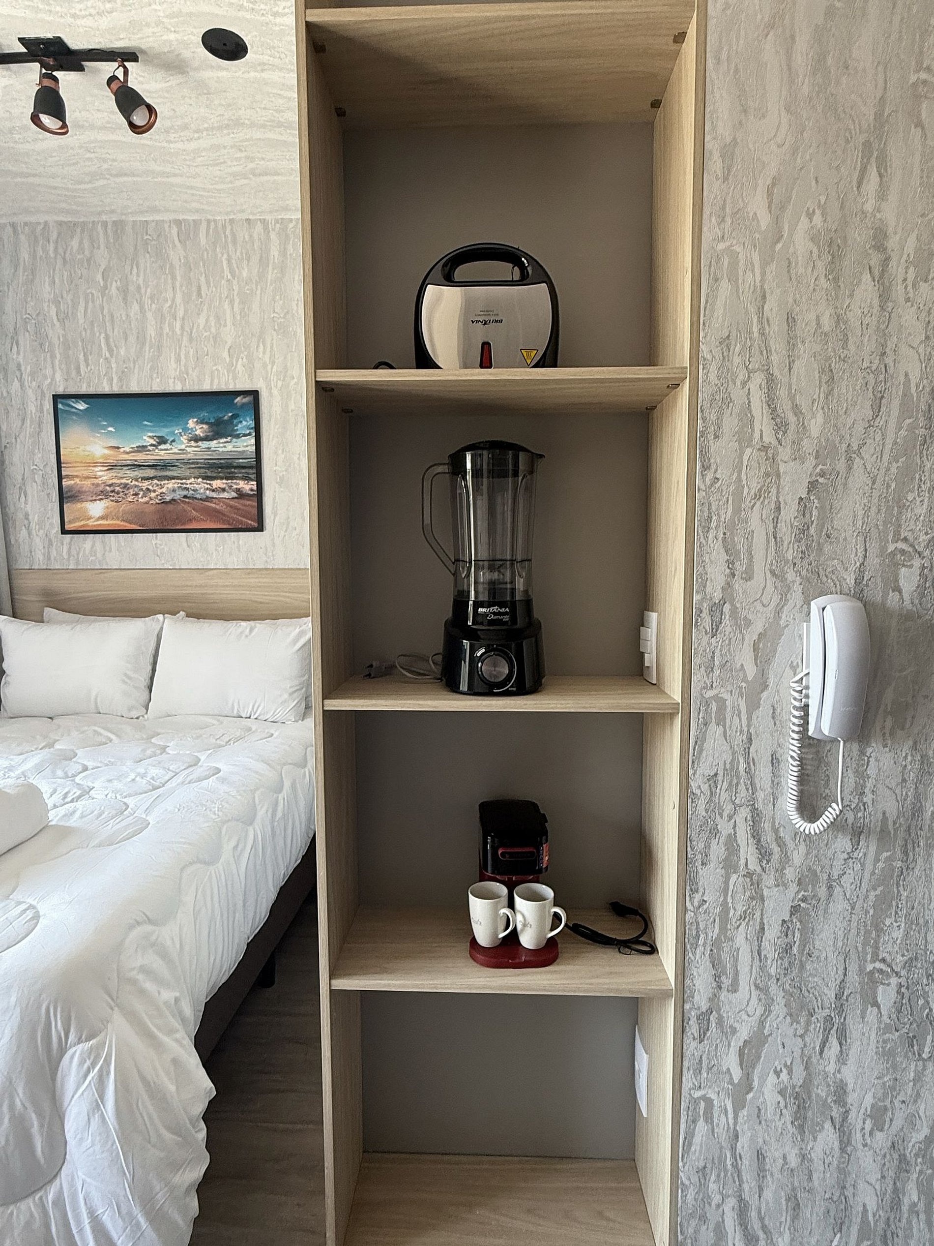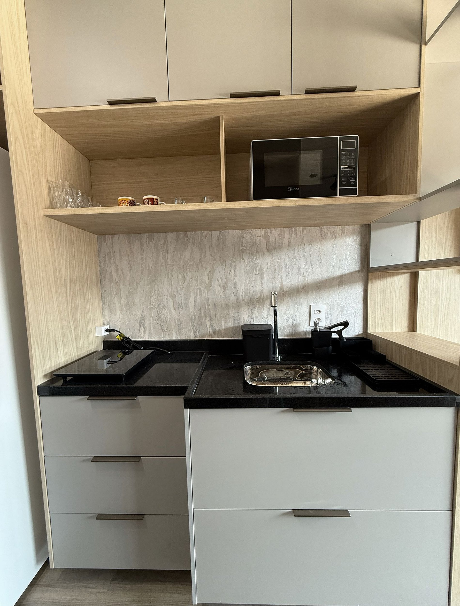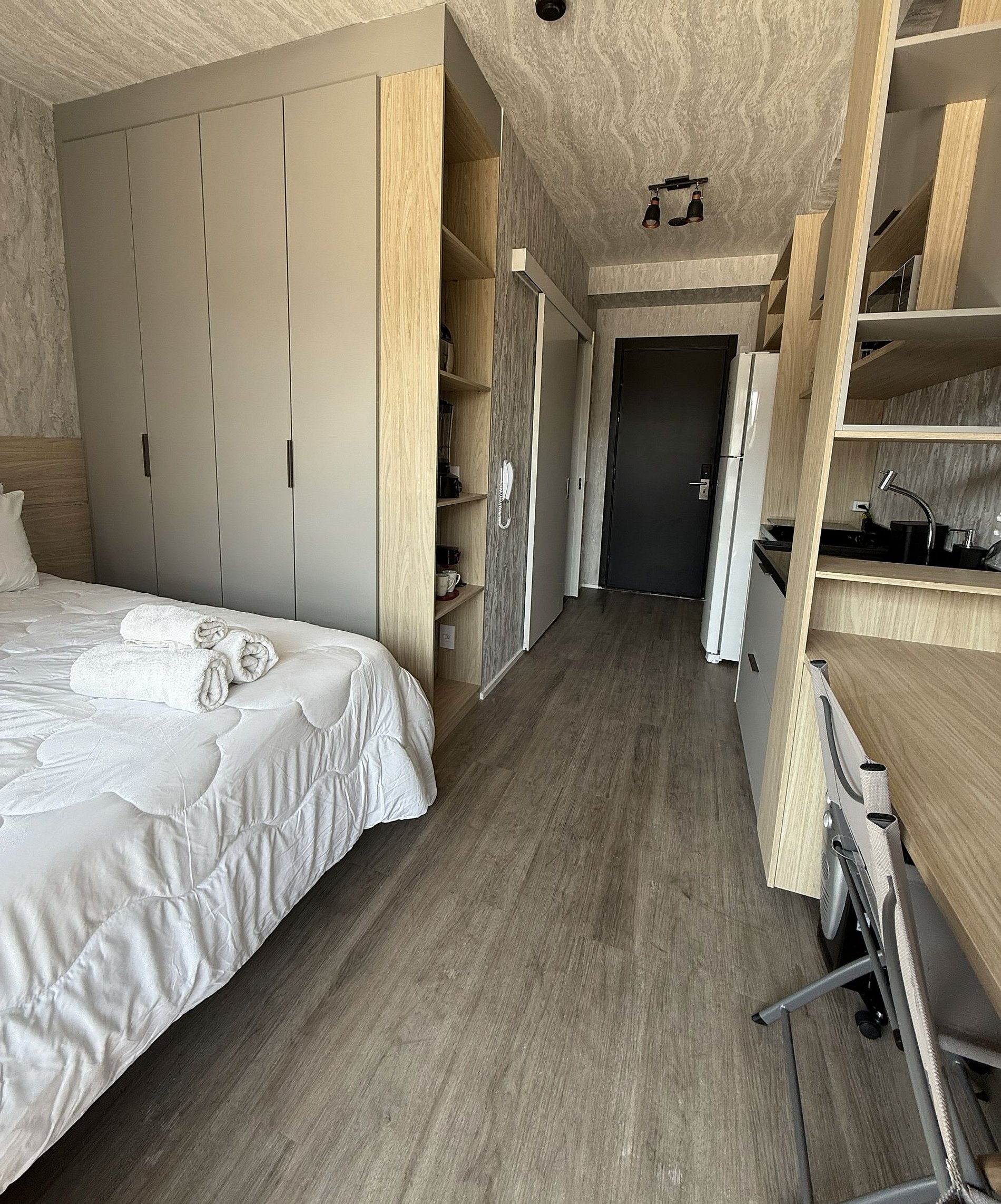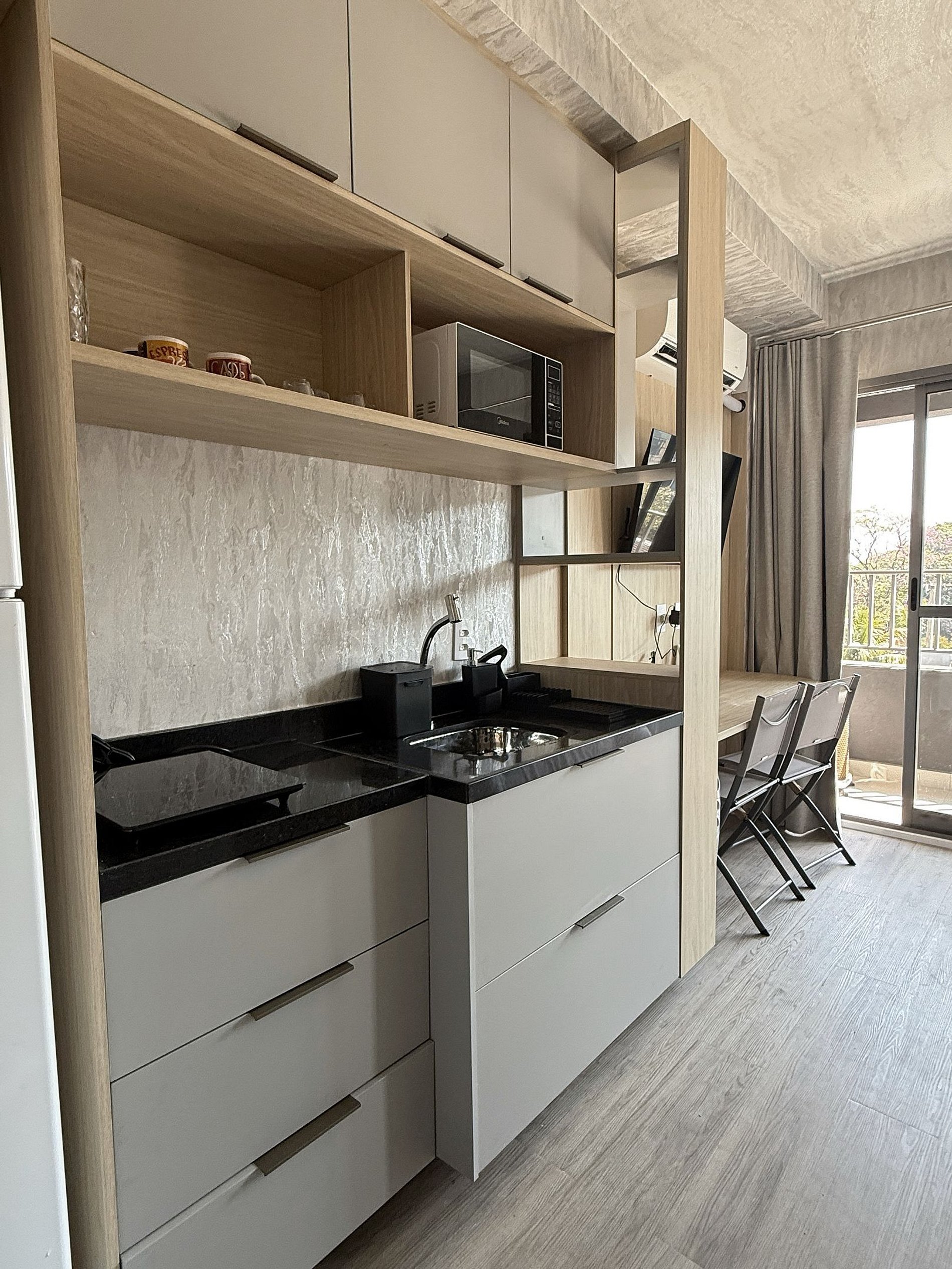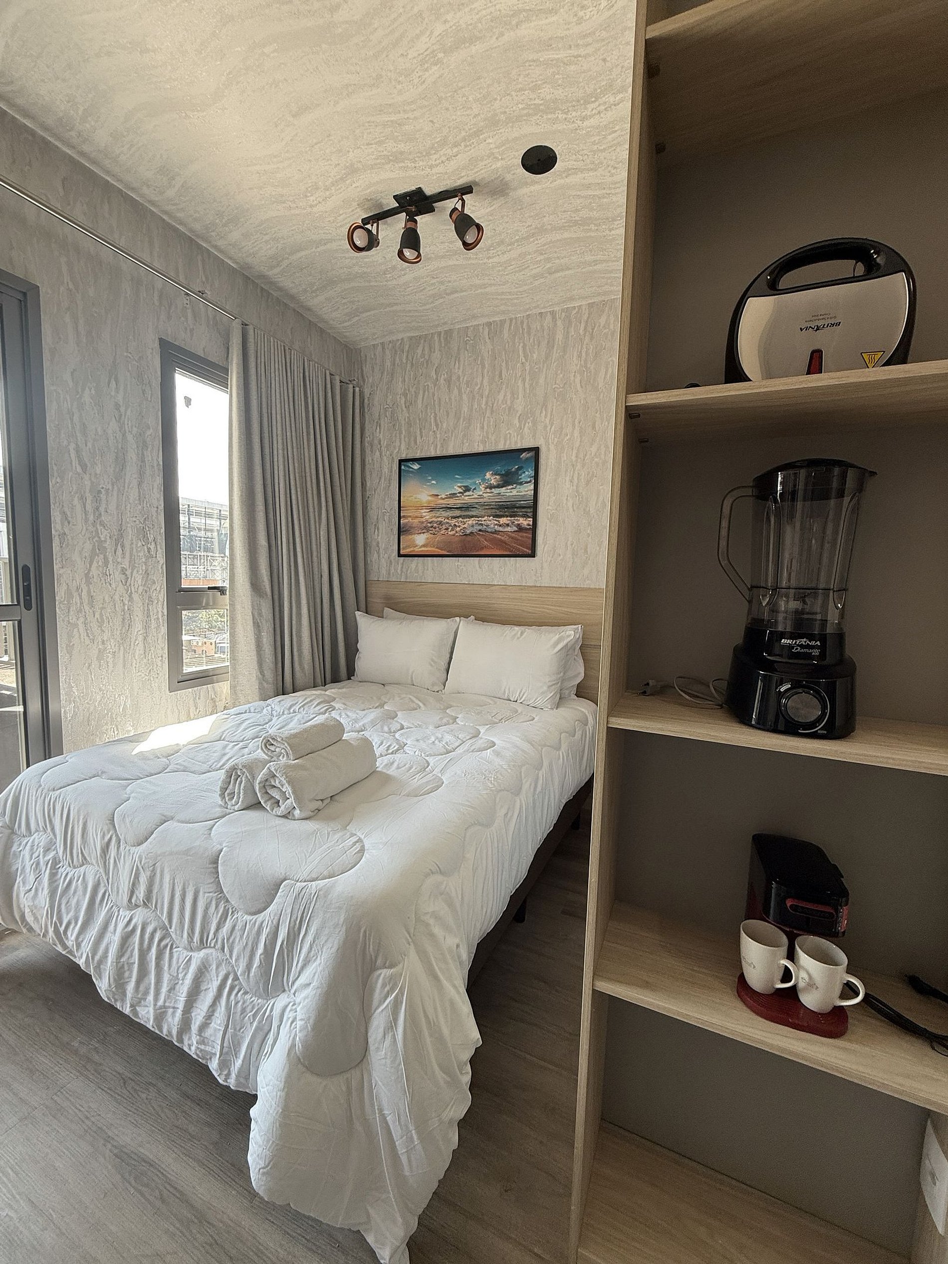 Curta uma experiência elegante neste lugar bem-localizado.Studio com móveis modernos e sofisticados, cozinha equipada com eletrodomésticos de primeira, utensílios como louças, taças, jogo de panelas, talheres etc. Salas equipadas com Smart TV e Wi-Fi.