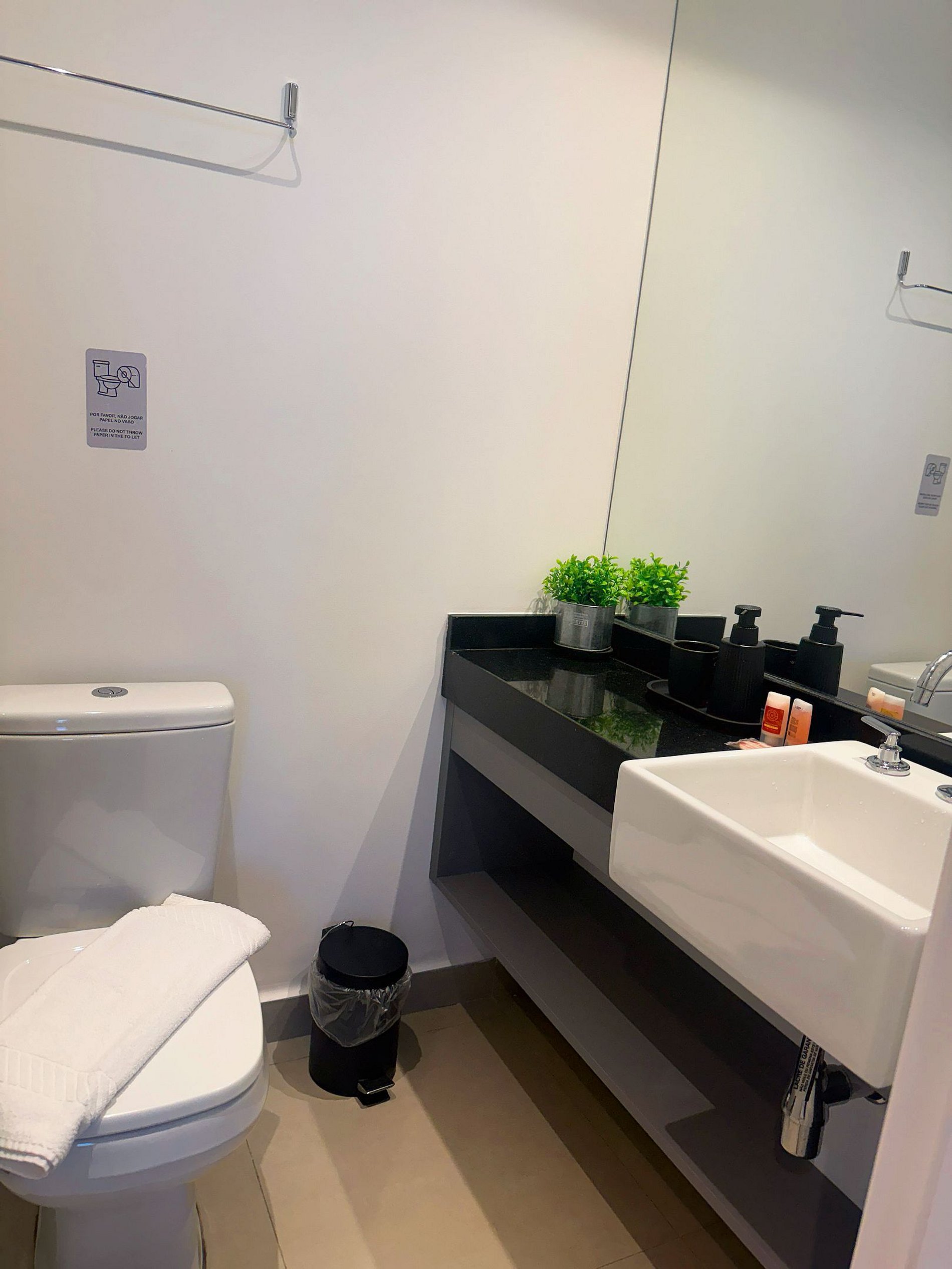 • Banheiro: Design sofisticado e ducha com sistema de alta pressão.