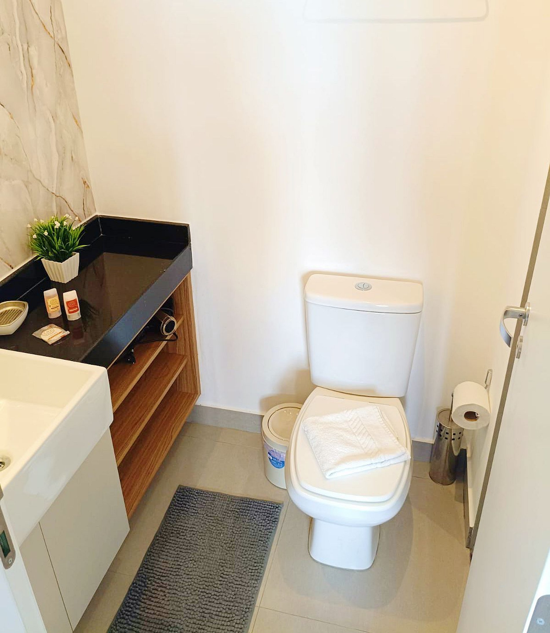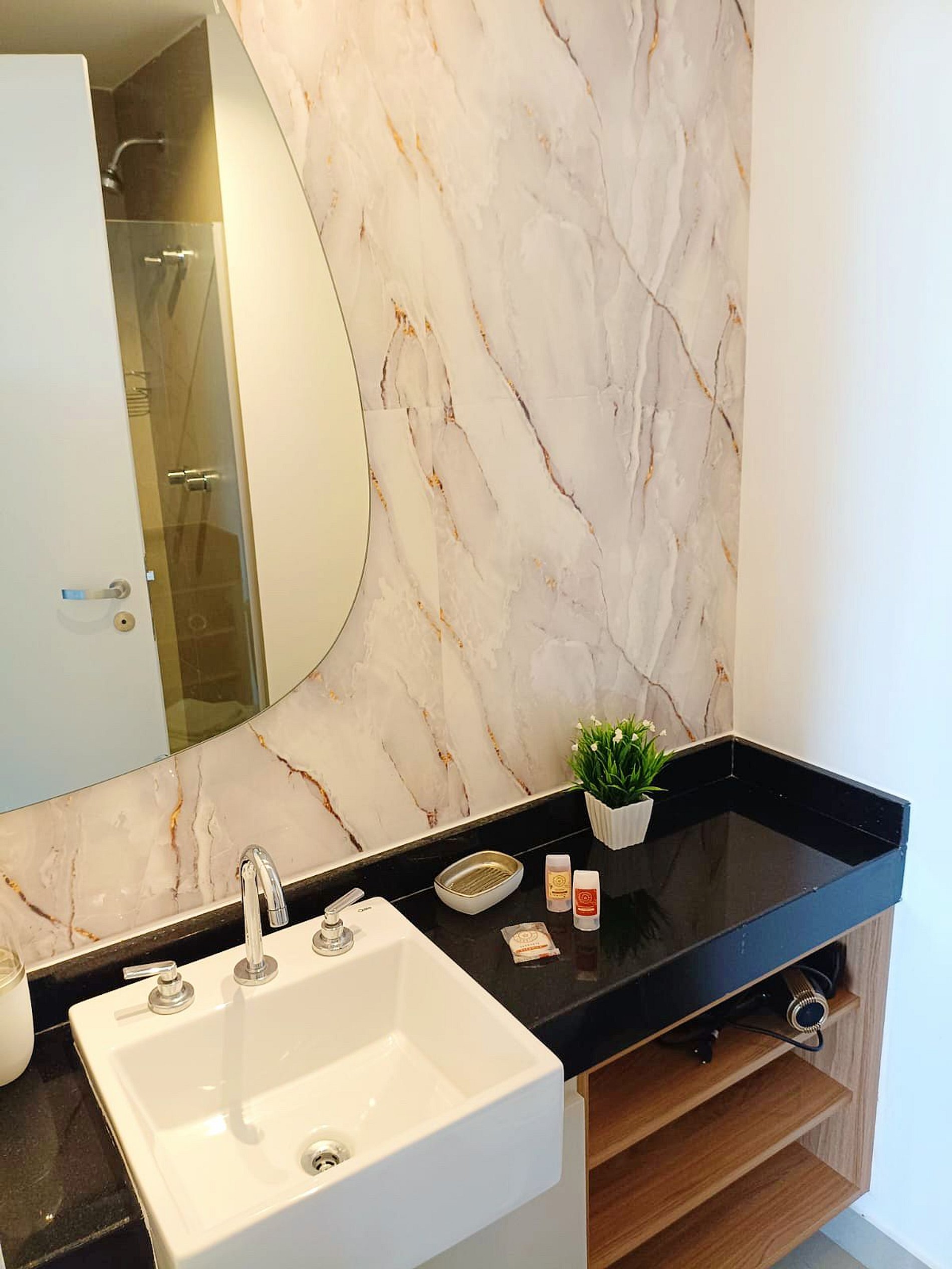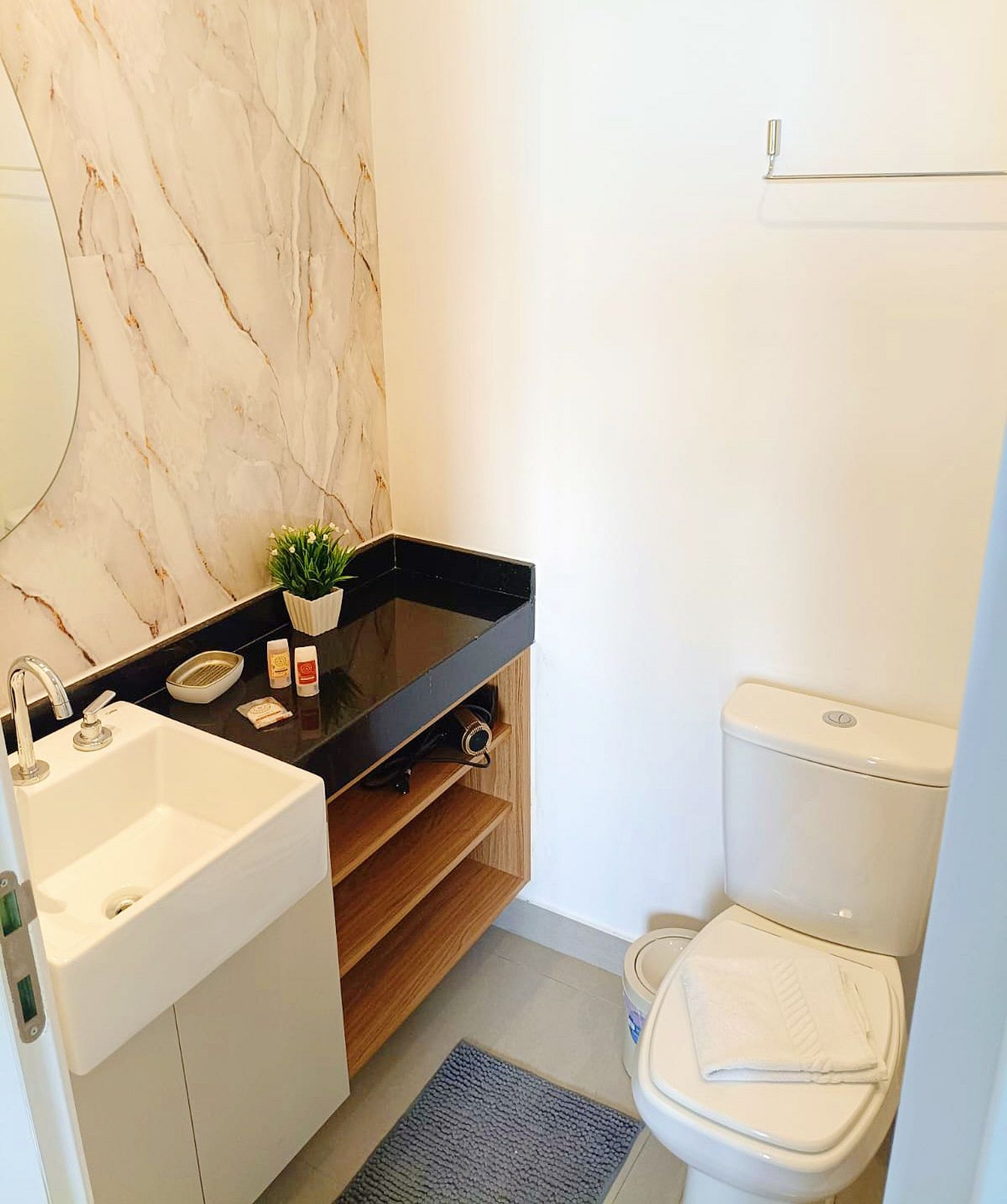 • Banheiro: Design sofisticado e ducha com sistema de alta pressão.