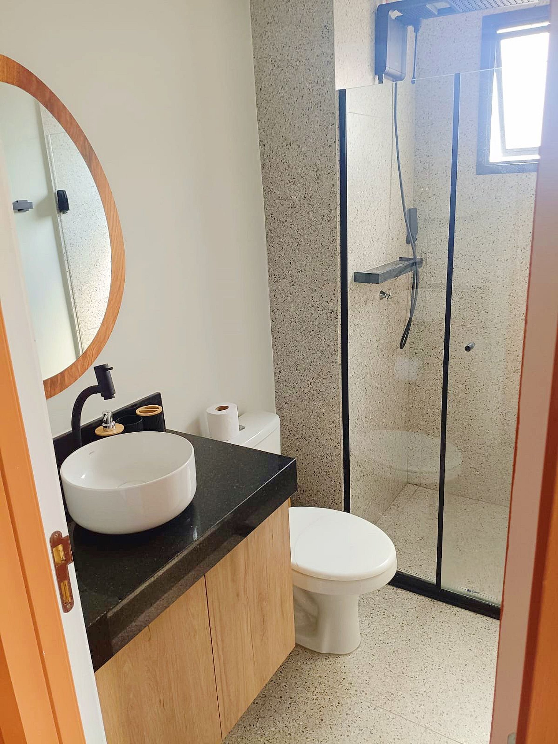 • Banheiro: Design sofisticado e ducha com sistema de alta pressão.
