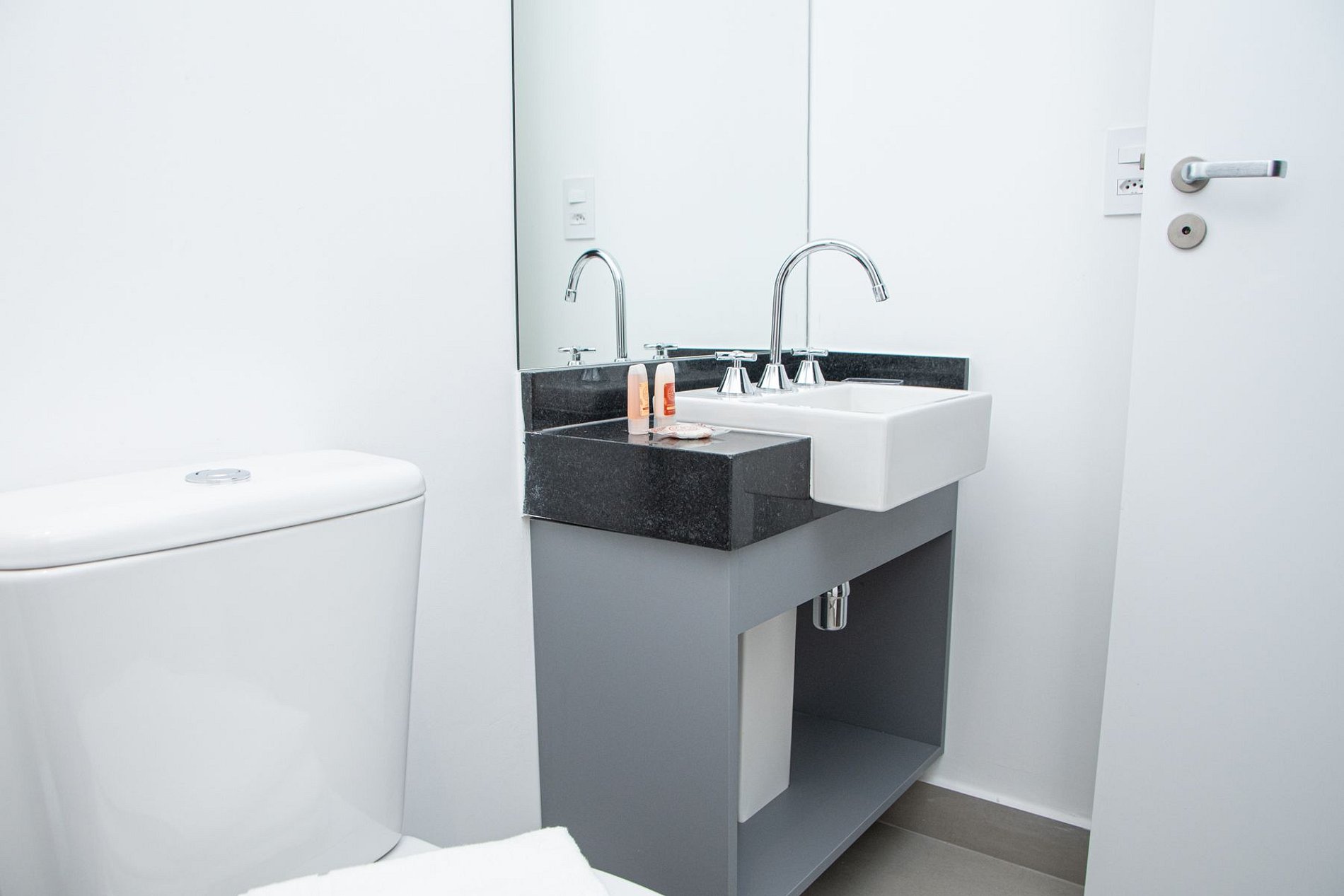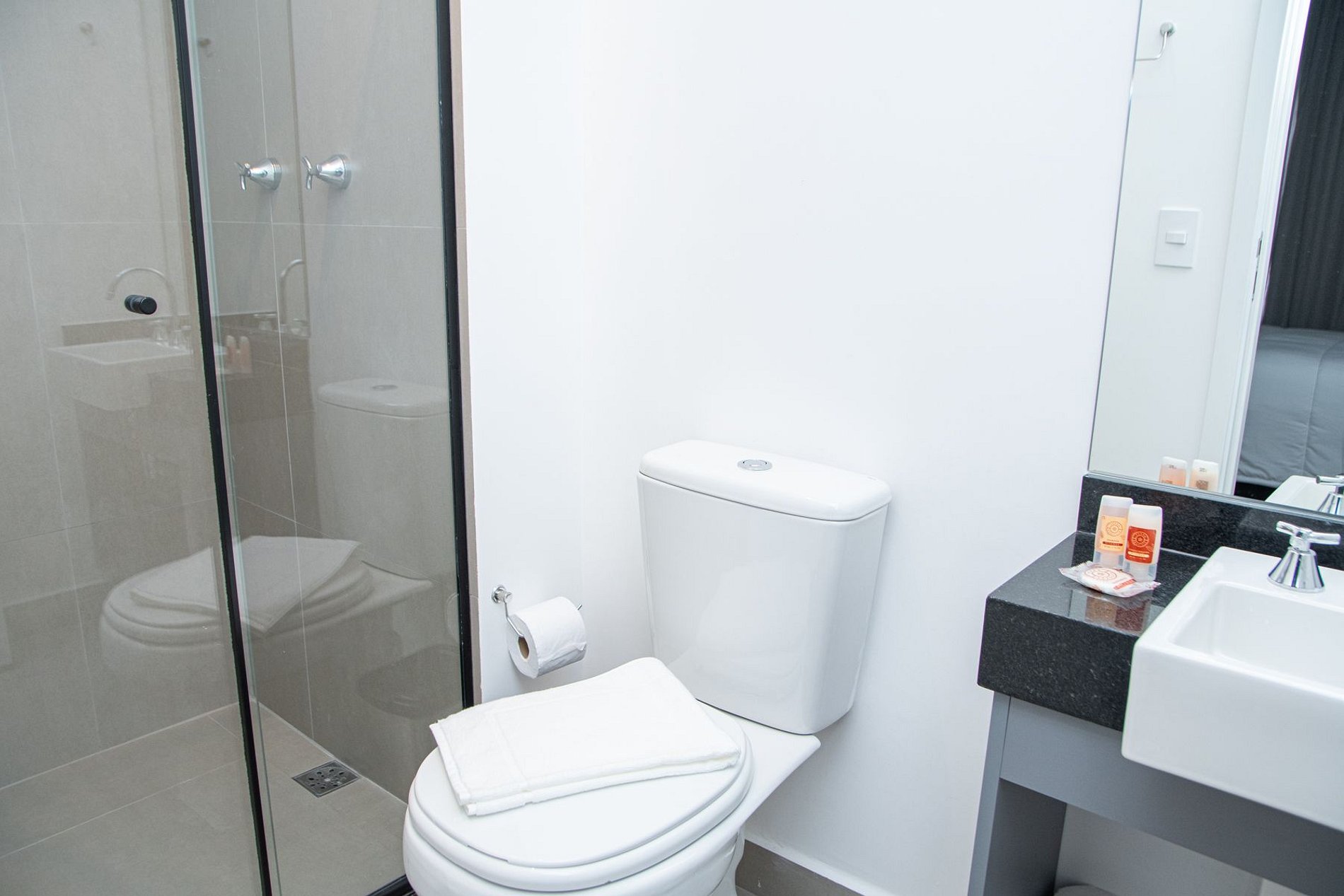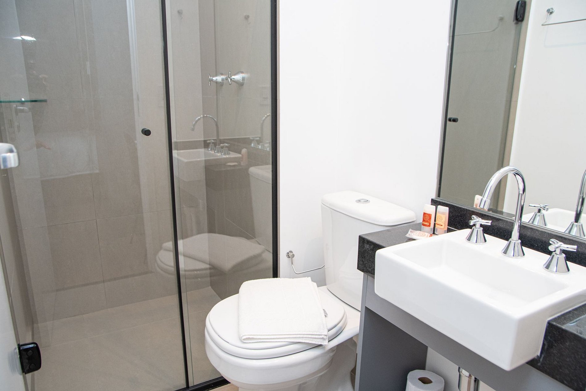 • Banheiro: Design sofisticado e ducha com sistema de alta pressão.