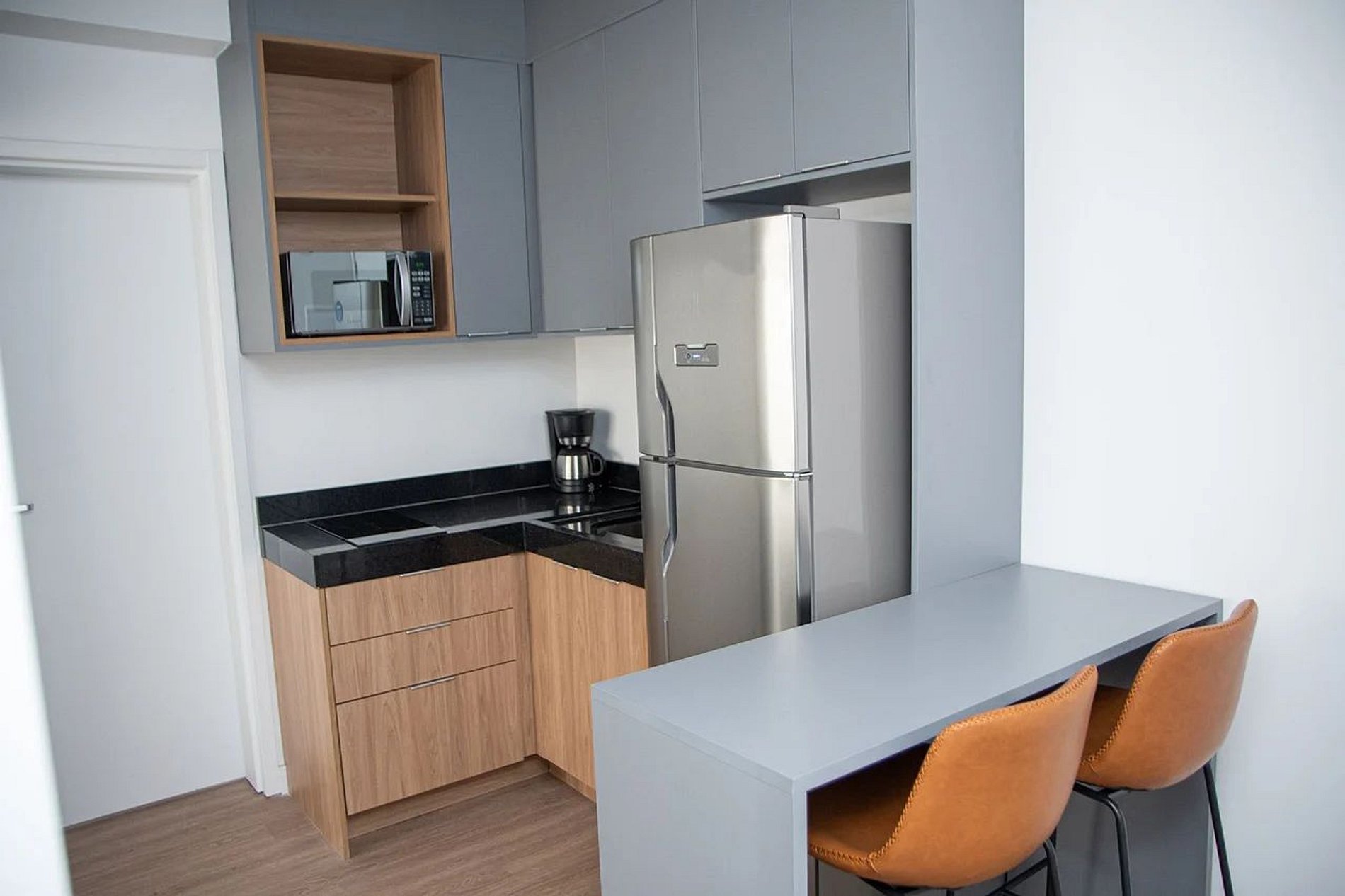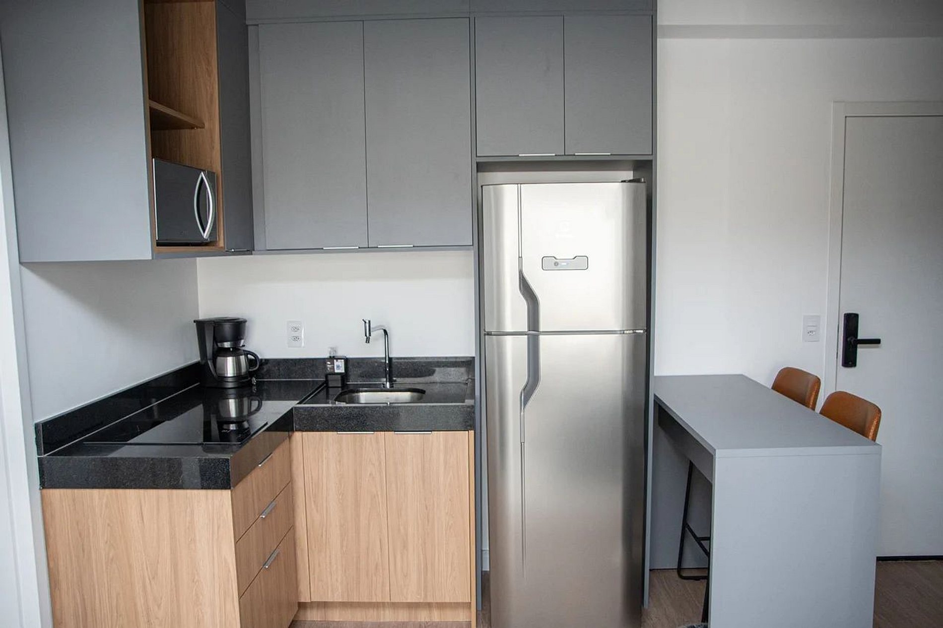 Apartamento elegante de 2 dormitórios, com móveis modernos e sofisticados. A cozinha está totalmente equipada com eletrodomésticos de alta qualidade e todos os itens essenciais — louças, taças, panelas e talheres.