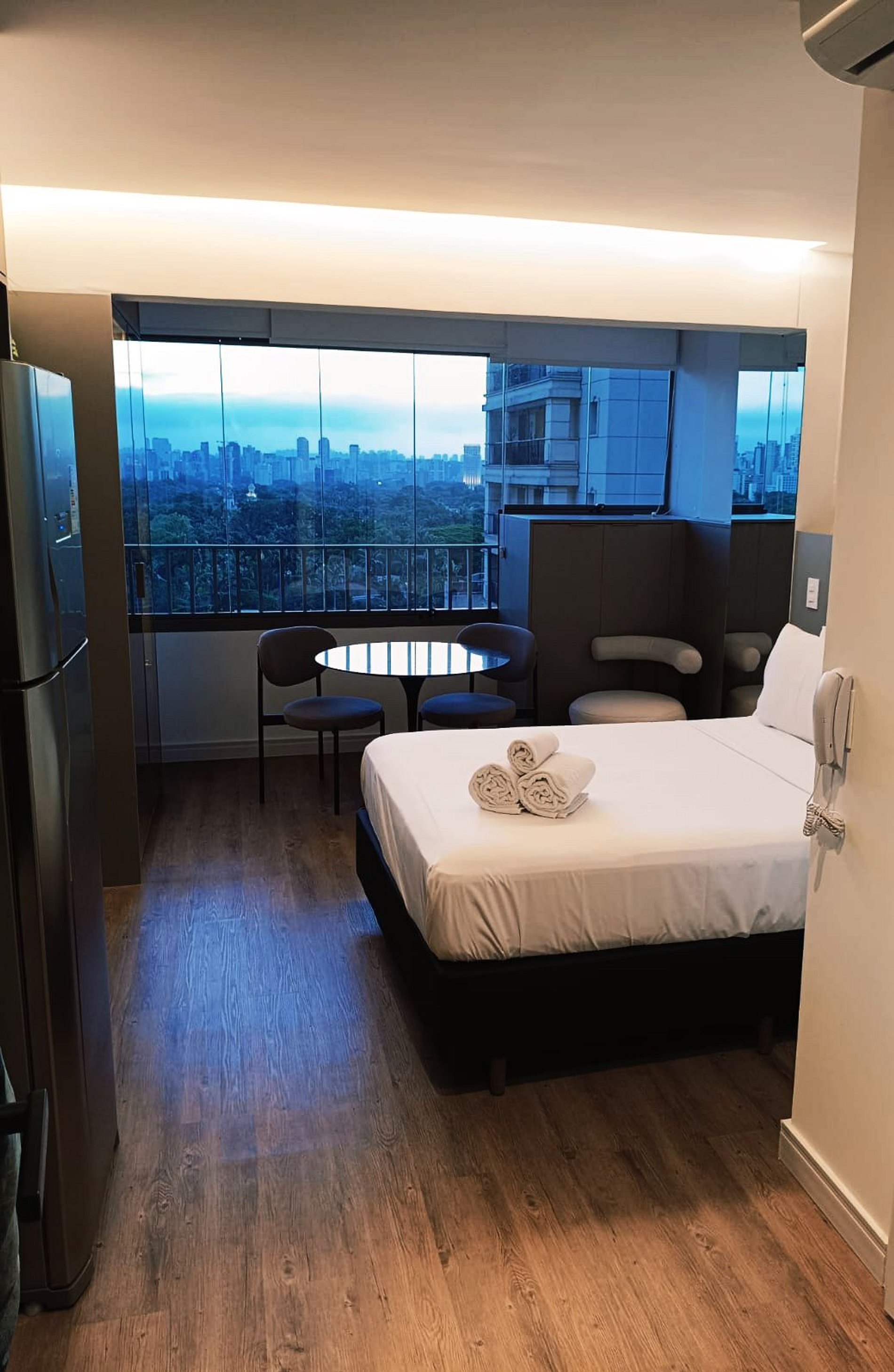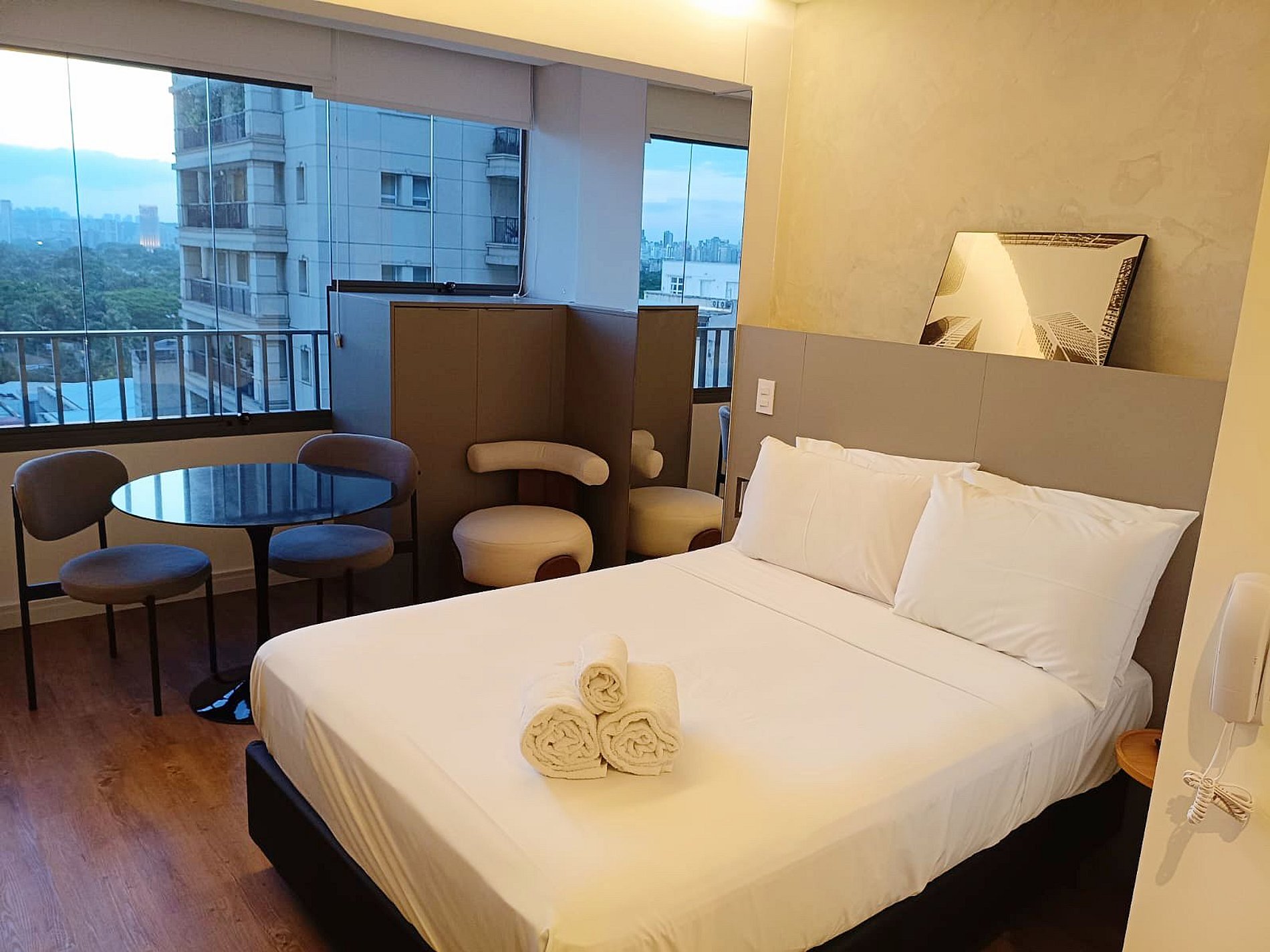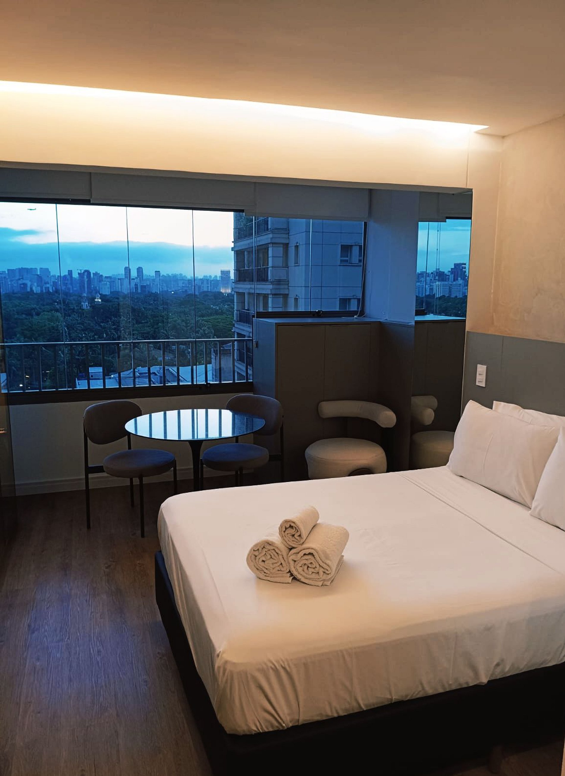 Nossos studios foram pensado para quem não abre mão de estilo, conforto e praticidade. Imagine um lugar onde o design contemporâneo encontra o aconchego de um lar, criando o cenário perfeito para sua viagem a São Paulo. É o equilíbrio ideal entre a exclusividade de uma hospedagem boutique e a sensação de estar em casa.